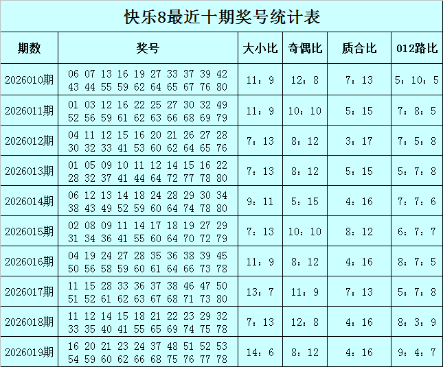 福彩快乐8第2026019期开奖回顾:16 20 21 23 24 37 48 51 52 53 54 59 60 62 66 68 75 76 77 78,其中奖号大小比开出14:6,奇偶比开出8:12,质合比开出4:16,012路比开出9:4:7。